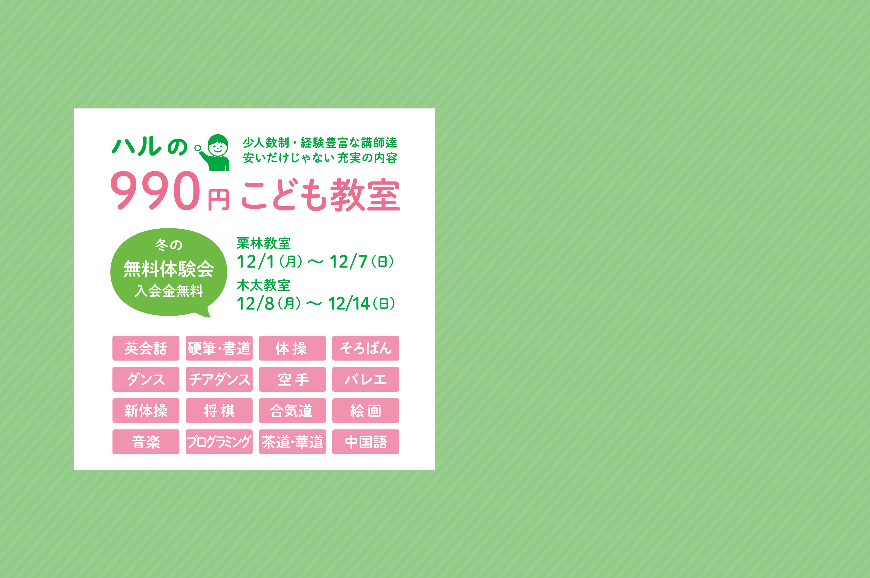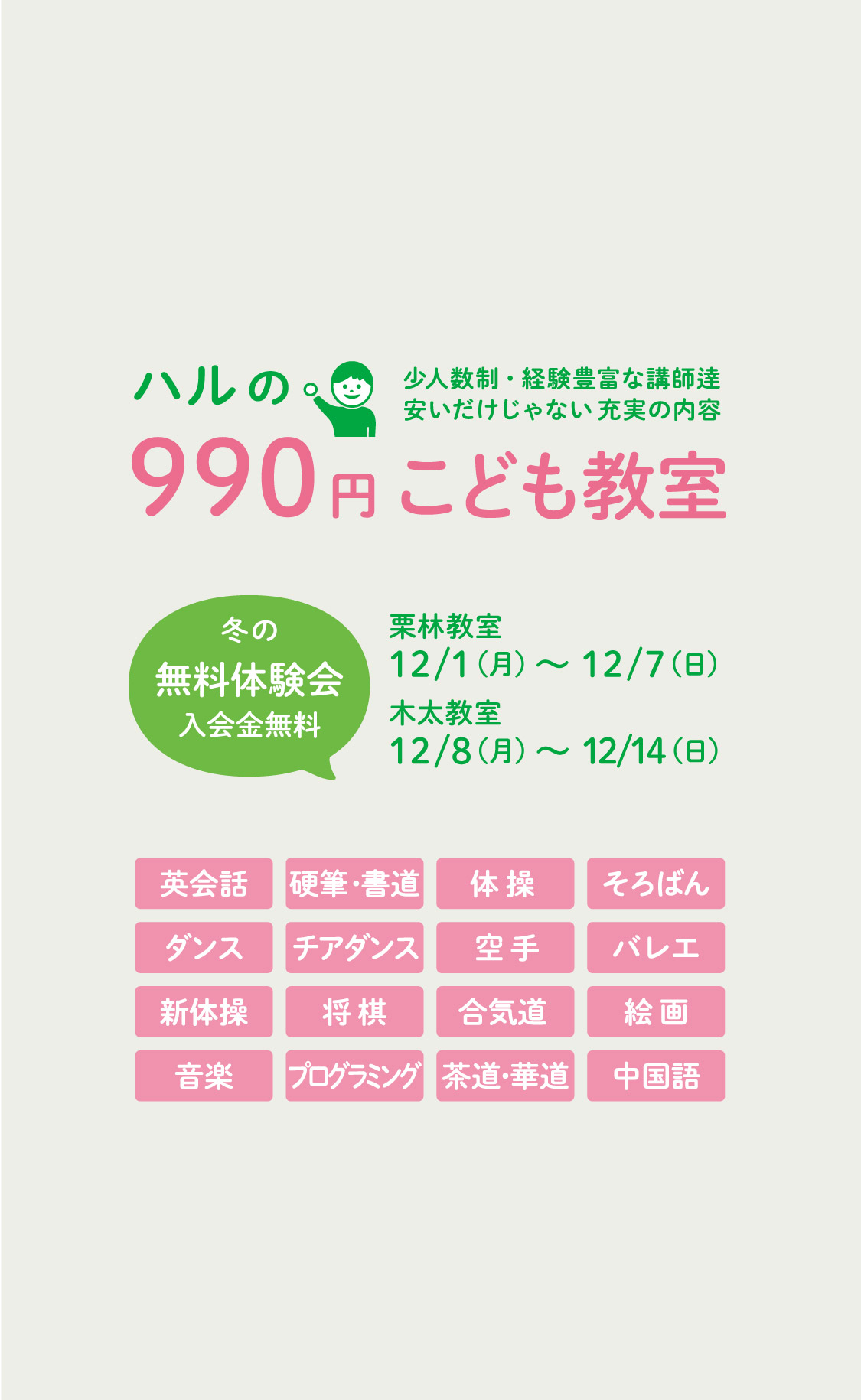 こどもたちの可能性を広げるために、ハルでは16種類のこども教室を1コマ990円(税込1,089円)で開講しています。参加しやすく続けていただきやすくするために、お母さんやお父さんにも安心してお預けしていただけるお値段と、内容にもご満足いただくための経験豊富な講師達をご用意いたしました。また、ハルでは安いから大人数でということはありません!どのクラスも少人数制で先生の近くで受講していただけます。定期的に授業参観や昇級テストを行い、保護者の方にもこどもたちの成果をご報告しています。